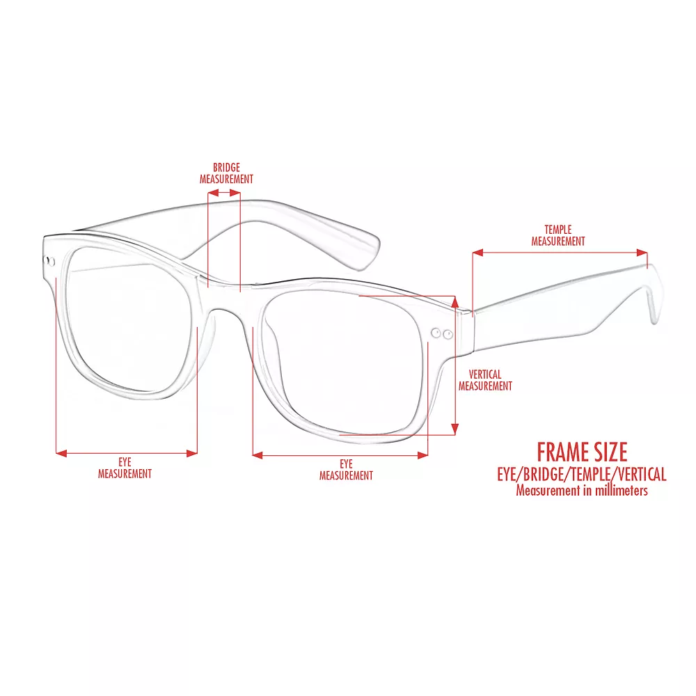 - Eye/bridge/temple/vertical size: 60mm/18mm/132mm/57.5mm