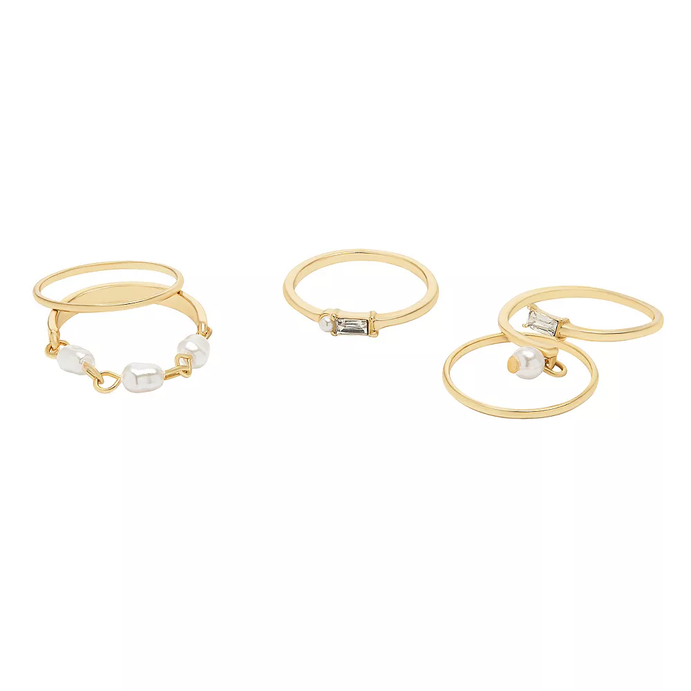 Be set up for fashion success with this LC Lauren Conrad Gold Tone Clear Baguettes and Simulated Pearls Multi Ring Set.