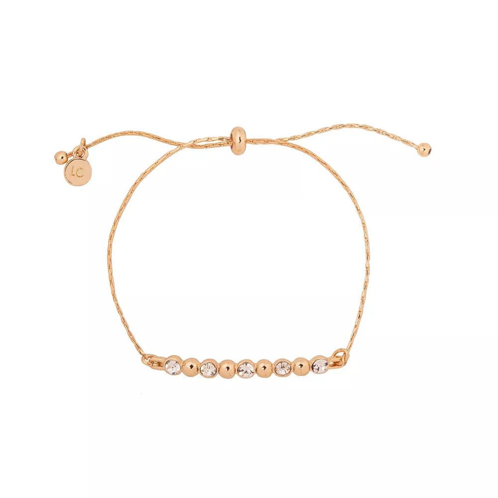 This LC Lauren Conrad Gold Tone Simulated Crystal and Metal Ball Bar Nickel Free Pull Tie Bracelet is full of life and charm.