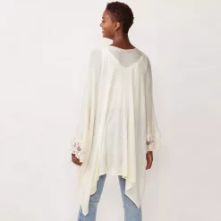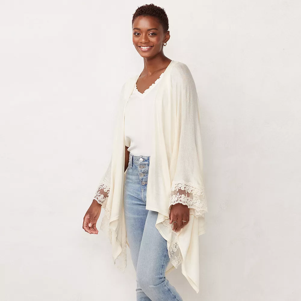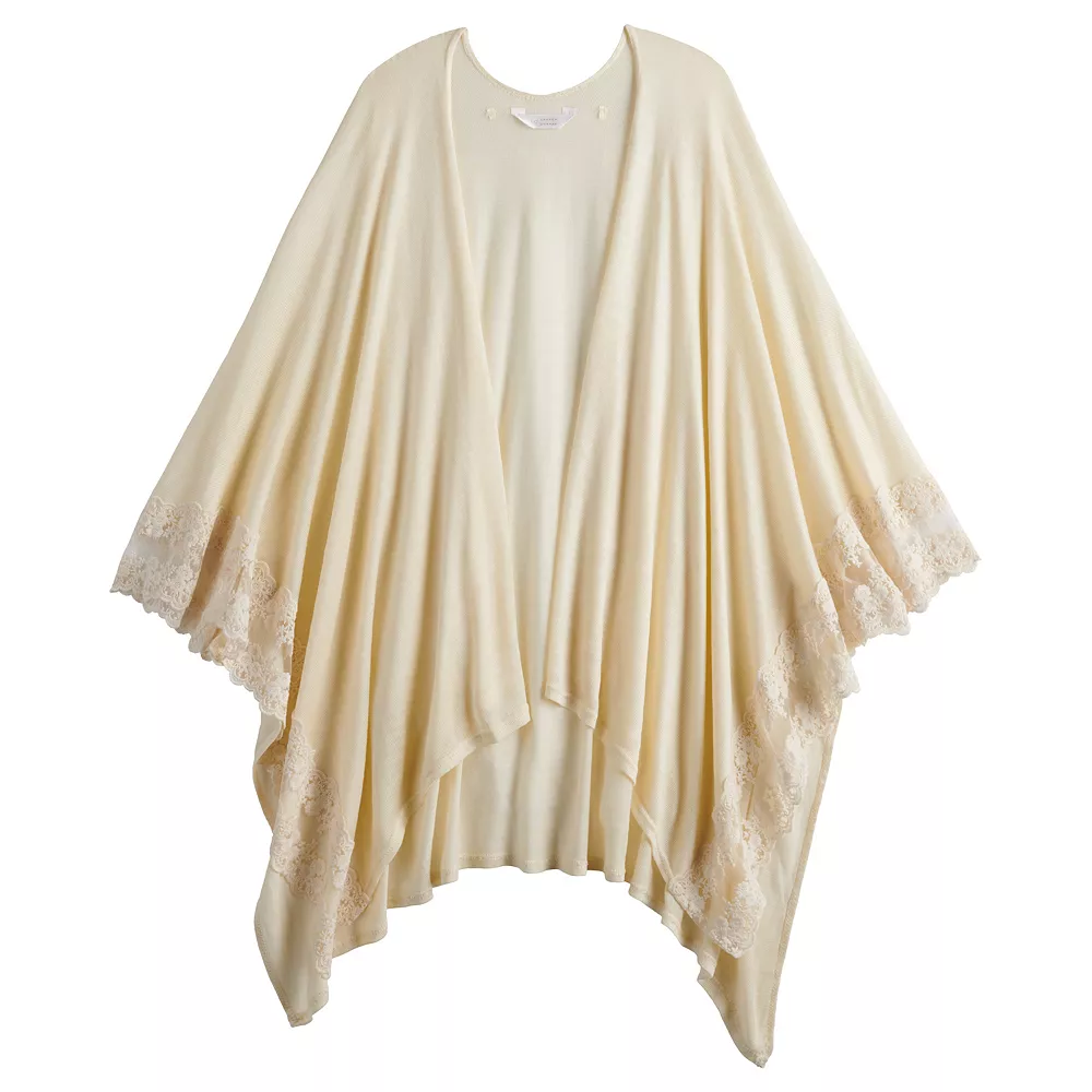 This lightweight lace-trimmed ruana adds a delicate touch to your look.