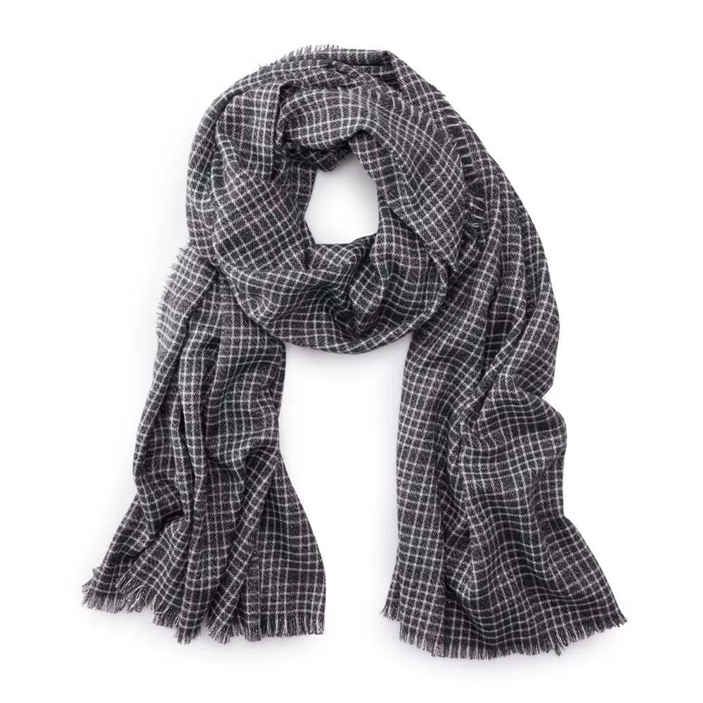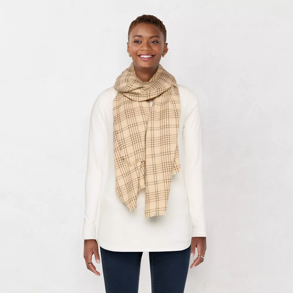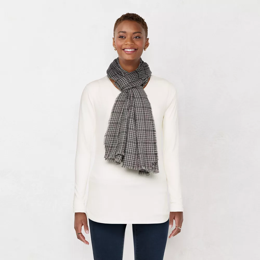 Stay warm and shiny when you wear this Women’s LC Lauren Conrad Mini Plaid Scarf with Metallic Shine.