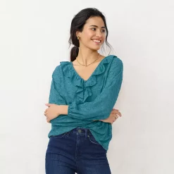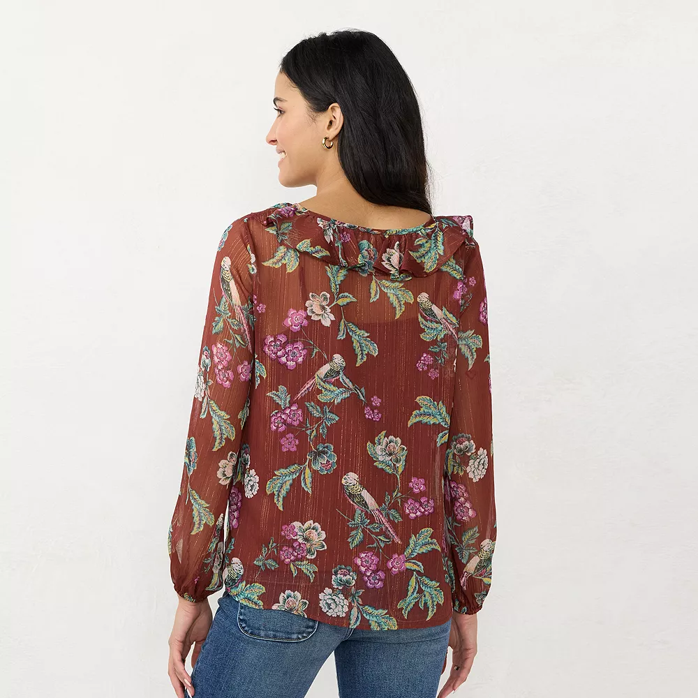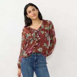 Ruffle details give this women’s LC Lauren Conrad peasant blouse a chic, casual look.